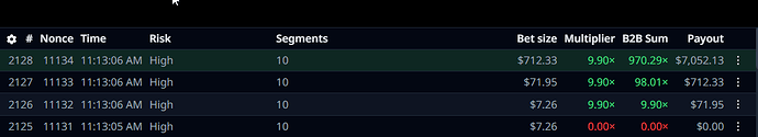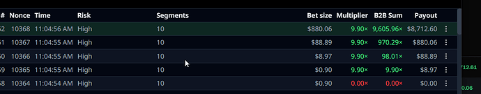 Happened upon a beautiful cluster of massive b2b hits all within ~1000 nonces while running 10 segment high risk wheel. Ran my $37 reload up to ~40k cash out in less than 30 minutes - all from $0.90 starting bet. B2B is by far my favorite feature of Antebot.