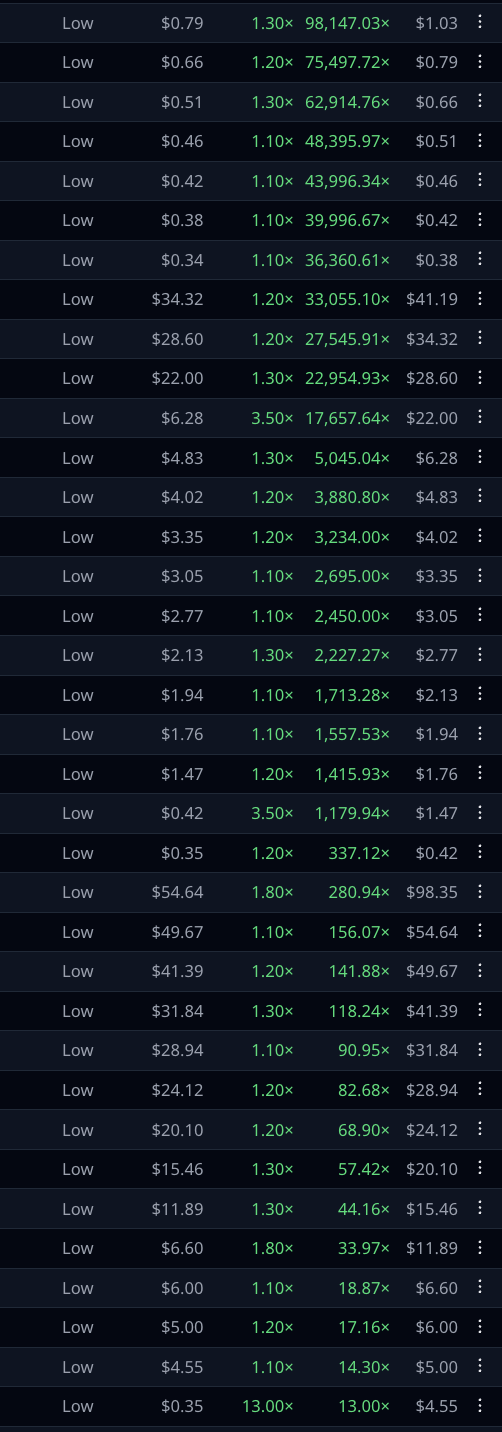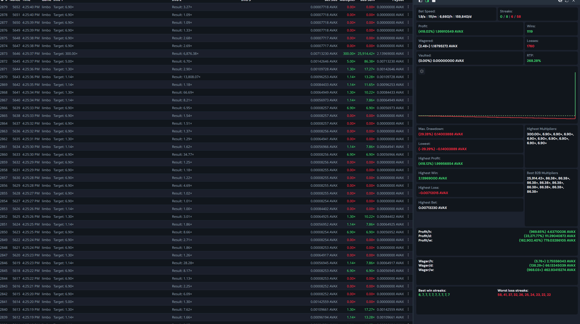 The reason im posting is I wanted to share some interesting findings I have been having while trying to decide on a multi combo for a b2b script have been running. These are all in simulation mode, but my simulation mode behaves pretty close to the same as my actual casino does, so not too unrealistic for these to occur. I was doing this initially with the goal of leaving it running and trying to maintain a decent profit per hour while also having a certain stop loss hit and trying to find a nice combo that stays away from about 3/4 of my stop loss for the most part that will also continuously, more often than not, profit 3x my starting balance before reaching the 3/4 drawdown. During this testing I have come across a ton of huge b2b multis, most happening in under 1 minute from starting the script. I was wondering if anyone else had similar findings or had a combo multi sequence they prefer that gives a high multi more frequently than other combos that have been tried. Keep in mind all of these pics are from about an 8 hour period of testing and i have dozens more that are 15kx-50kx that also happened in the same testing run, just dont want to post all of them as im sure these get the point across. Back to back has to be one of my favorite features of the bot and this was just was interesting at the very least so figured I would share here. Let me know what combo sequence you all find most fruitful for huge multis. Going to be big b2b hunting all day haha, good luck and big wins to all!