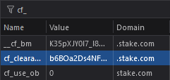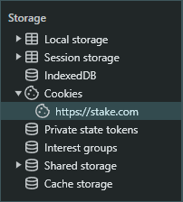 menu) - On the left side of the navigation navigate to Storage > Cookies > https://stake.com (or the mirror that you're on)